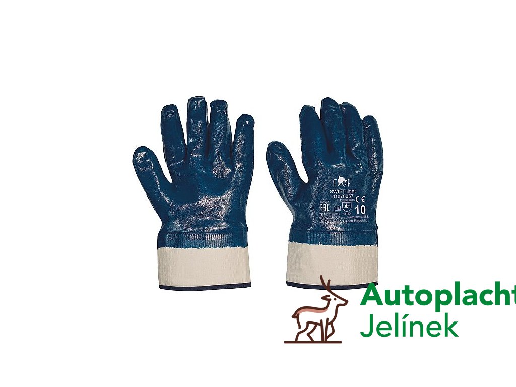 • šité rukavice z bavlny • máčení v nitrilu • pevná manžeta
